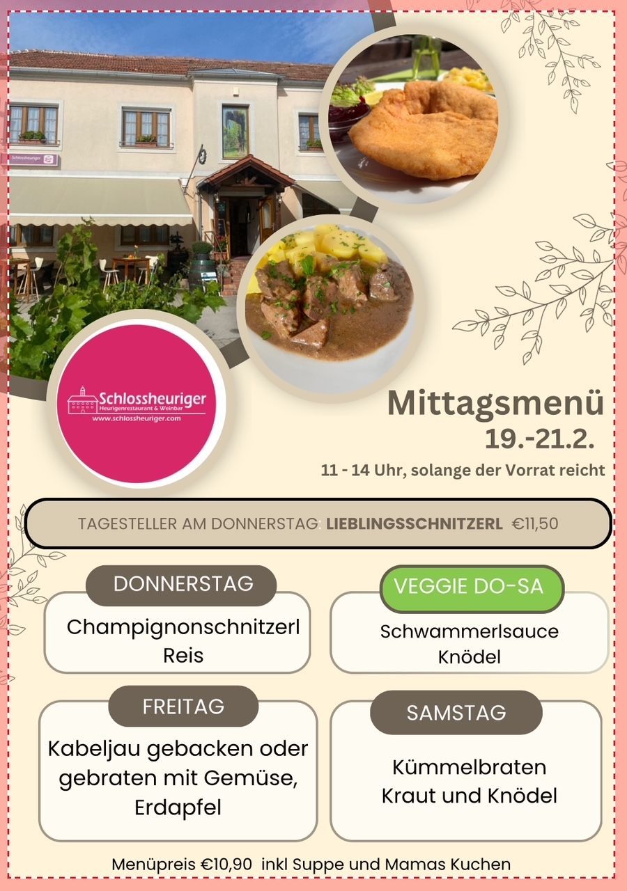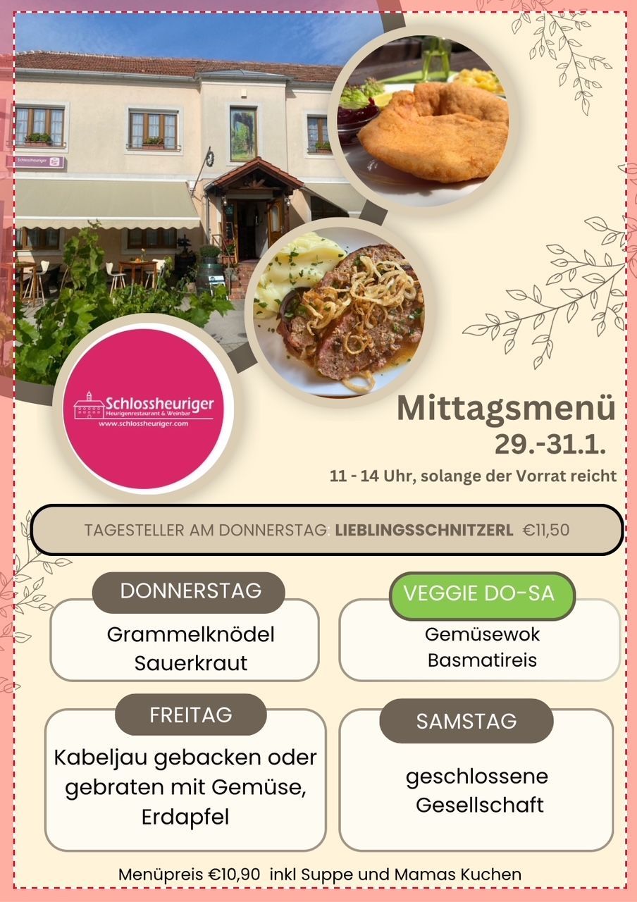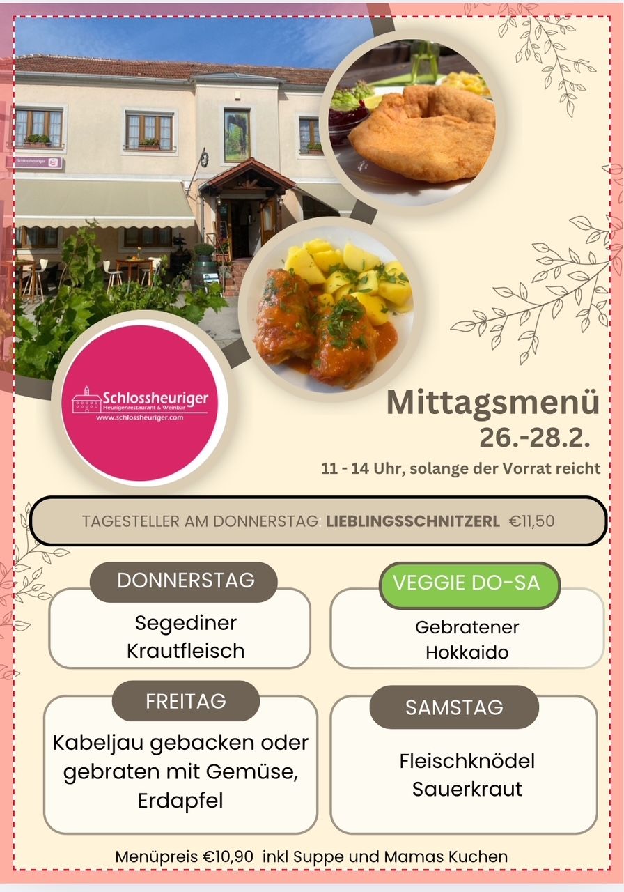 Unser Mittagsmenü bietet eine ideale Option für Gäste, die sich bewusst und zeitsparend verwöhnen lassen möchten – ob im privaten Umfeld oder auf Geschäftsreise. Mit täglich wechselnden, saisonal abgestimmten Gerichten passen wir das Angebot flexibel an die frischen Produkte der Region an. Auch unser Mittagsmenü wird mit der gleichen Qualität zubereitet wie unsere Abendgerichte – genießen Sie herzhafte Speisen zur Mittagszeit im Schlossheurigen Vösendorf.