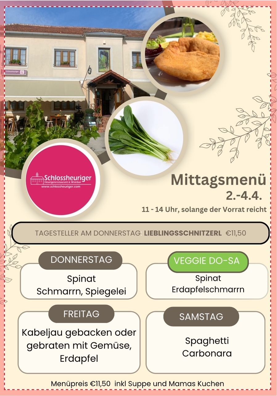 Unser Mittagsmenü bietet eine ideale Option für Gäste, die sich bewusst und zeitsparend verwöhnen lassen möchten – ob im privaten Umfeld oder auf Geschäftsreise. Mit täglich wechselnden, saisonal abgestimmten Gerichten passen wir das Angebot flexibel an die frischen Produkte der Region an. Auch unser Mittagsmenü wird mit der gleichen Qualität zubereitet wie unsere Abendgerichte – genießen Sie herzhafte Speisen zur Mittagszeit im Schlossheurigen Vösendorf.